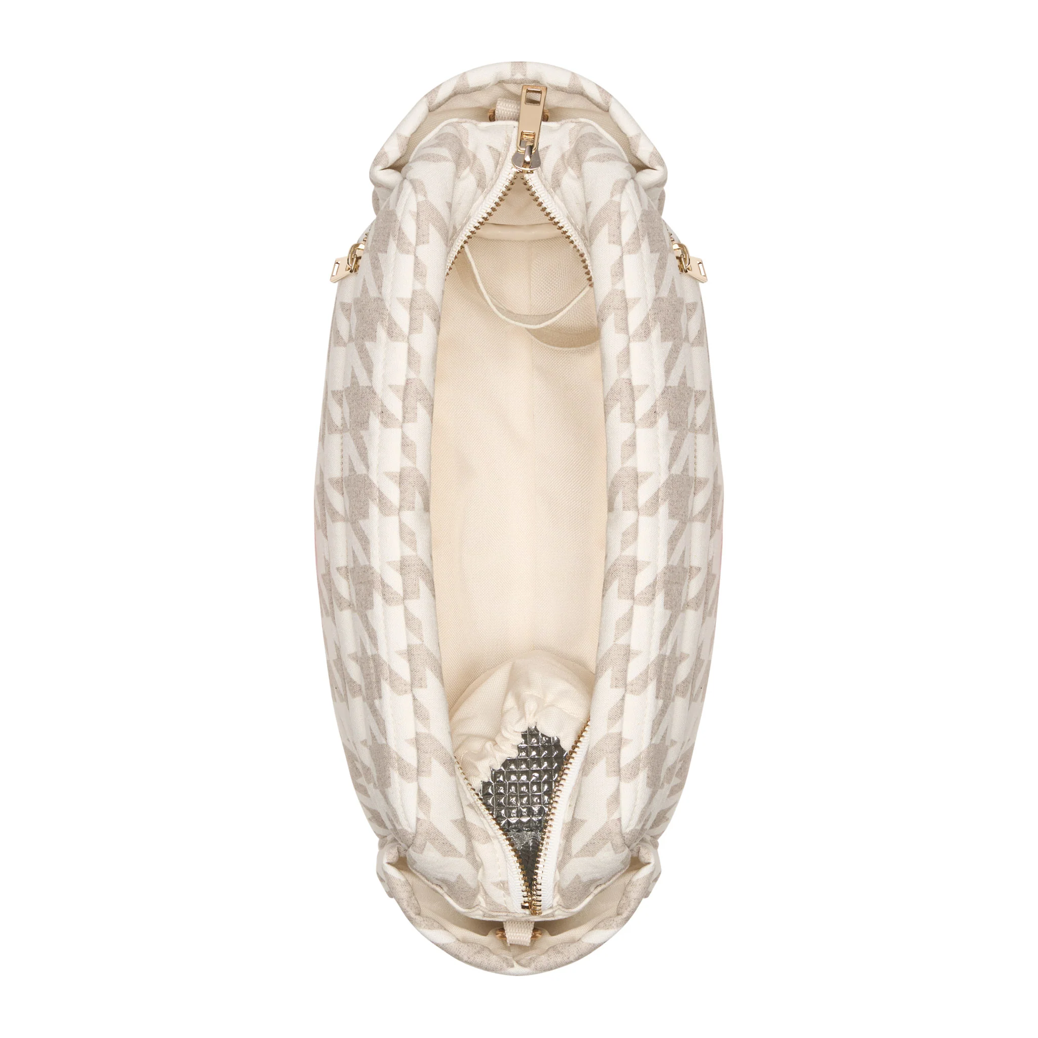 Two fixed pram straps with refined gold hardware clip on in seconds, while a considered five-pocket interior keeps everything in place: a spacious main compartment, insulated bottle pocket and elasticated holder. On the outside, twin bottle sleeves and a zipped pocket keep grab-and-go essentials secure. Clip on the matching strap to switch from pram to polished crossbody in one move.