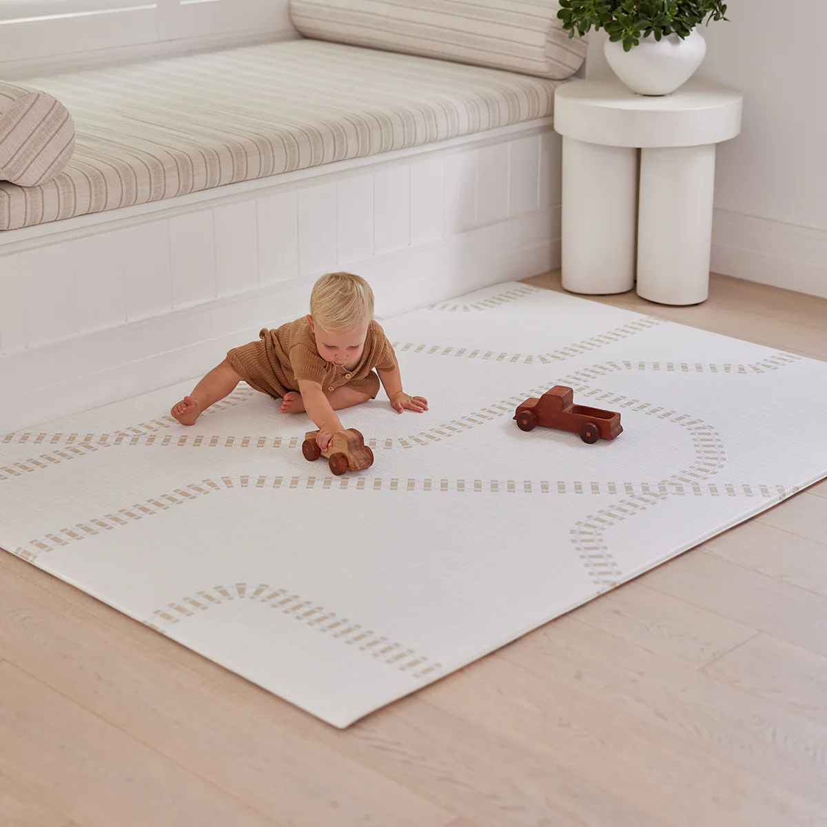 Designed to elevate your home's aesthetics, this versatile double-sided play mat offers the perfect blend of style and functionality. On one side, it showcases a modern border check rug design that mimics the appearance of an actual rug, seamlessly integrating with your home decor. Meanwhile, the reverse side features a subtle yet engaging track design that provides endless playtime for kids.